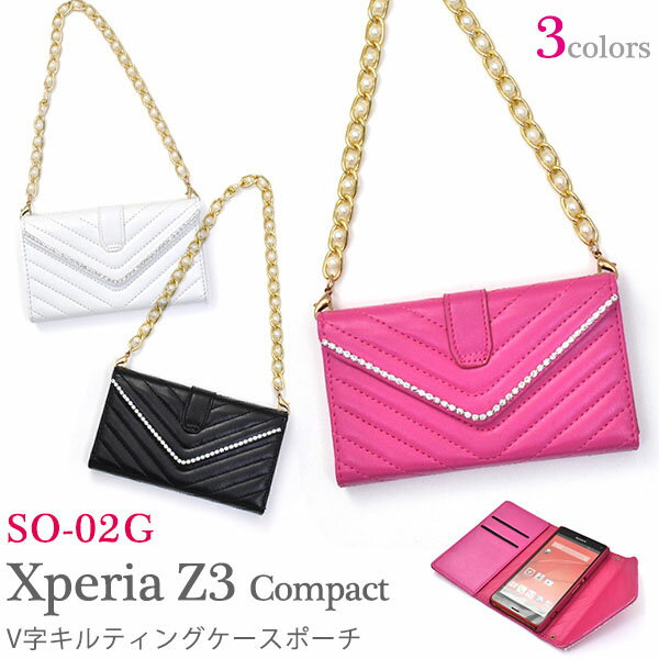 【領収書発行可能】チェーン付き Xperia Z3 Compact SO-02G用V字キルティングケースポーチ(全3色)★液晶画面も保護する三つ折り手帳タイプ!バッグみたいなデザインとラインストーンがかわいい エクスペリア コンパクト用ケース/ スマホカバー docomo